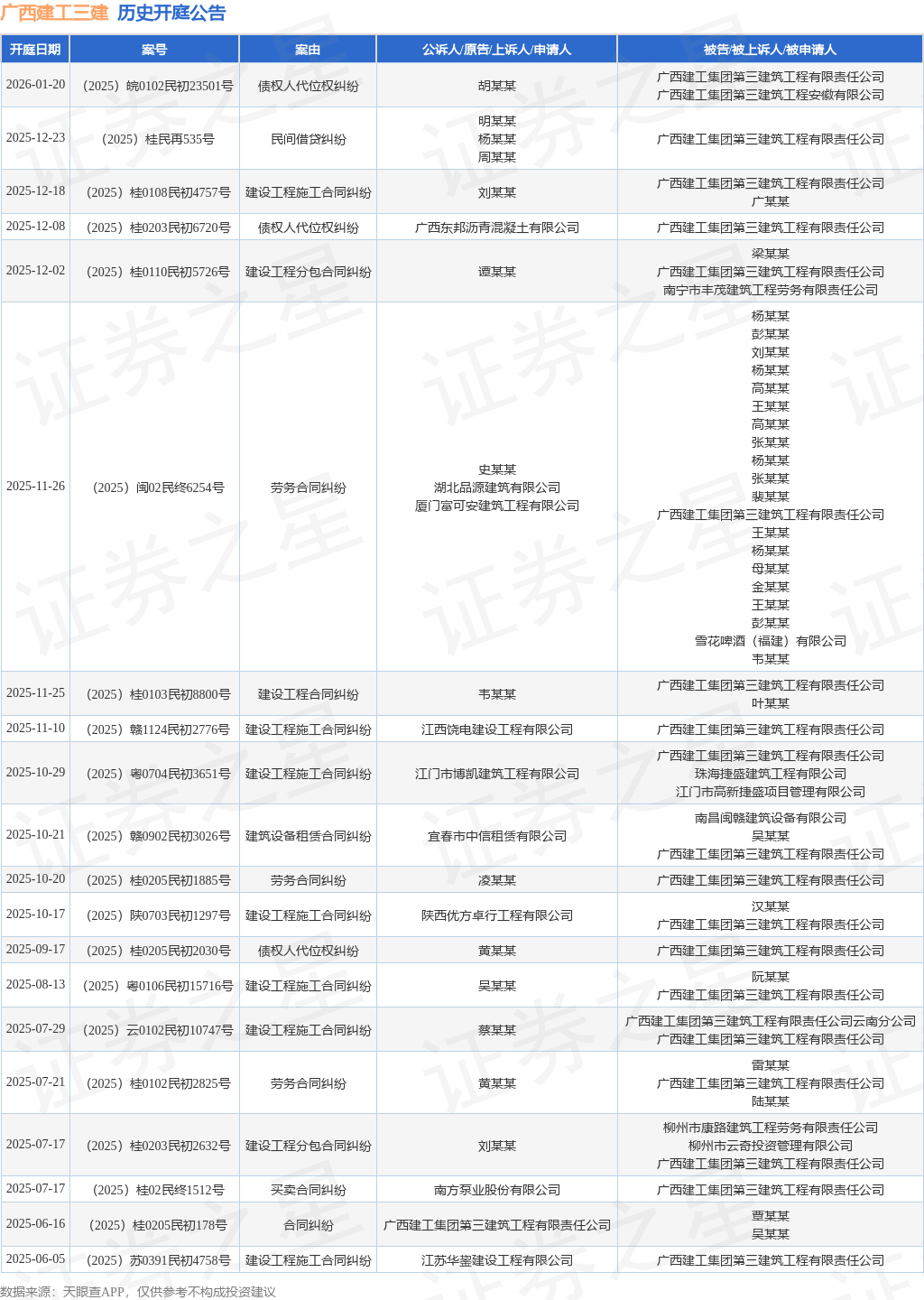 依据计算,近一年内以广西建工集团第三建筑工程有限责任公司为当事人的前史开庭公告有44则,其间案由为“建造工程项目施工合同纠纷”的公告以11则居首,其次为“生意合同纠纷”有8则,“劳务合同纠纷”有7则。前史开庭公告(前20条)如下: